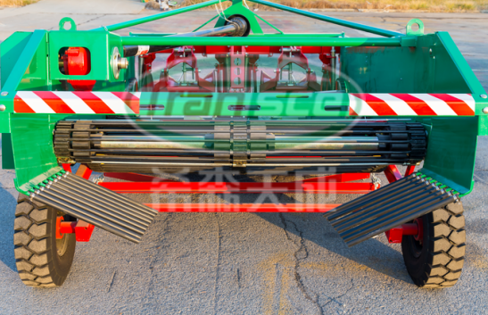分手清選后的土豆保送到機器的前方,經由過程調劑集條擋板的寬度,將土豆鋪放在空中上,以便撿拾。